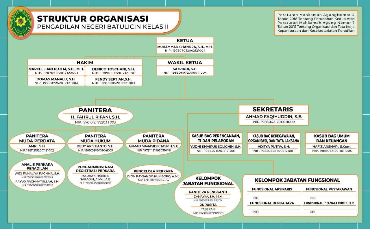 Sesuai dengan Peraturan Mahkamah AgungNomor 4 Tahun 2018 Tentang Perubahan Kedua Atas Peraturan Mahkamah Agung Nomor 7 Tahun 2015 Tentang Organisasi dan Tata Kerja Kepaniteraan dan Kesekretariatan Peradilan, maka secara organisatoris dan administratif Pengadilan Negeri Batulicin memiliki Struktur Organisasi sebagai berikut :